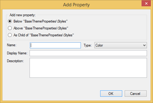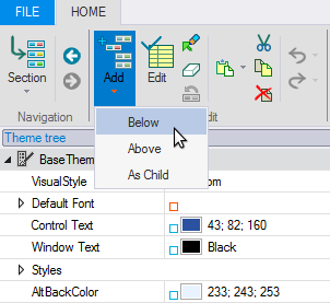 A new property can be inserted at a specific position in the Theme tree via the Add command button from the Edit group in the C1Theme Designer Ribbon menu.