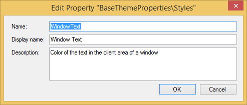 Edits the attributes (name etc.) of the current Base Theme Properties tree item. The Edit command is active when any of the items in the Base Theme Properties section are selected. Select an item in the Base Theme Properties that you wish to edit and then click on the Edit button. Clicking on the Edit button opens the dialog box: