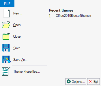 The File menu includes the following options: New..., Open..., Close, Save, Save As and Theme Properties.... Recent themes that were created appear to the right under Recent themes.
