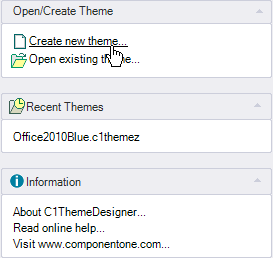 Load base theme file: You can open an existing base theme you created to add it to your WinForms theme. When you enter a Theme name in the Theme name: textbox the new Theme name will appear at the top of the Theme Designer: