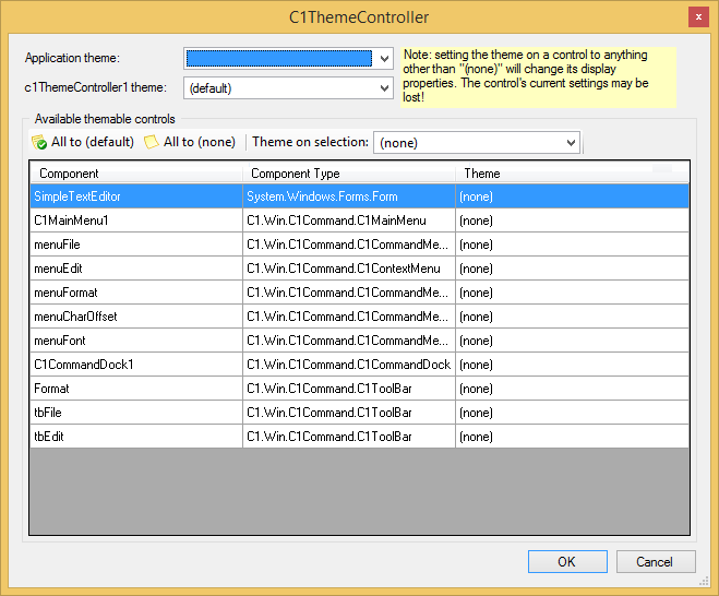 (When new controls are dropped on the form already containing a C1ThemeController component, theme is set to "(default)" on them automatically.) |