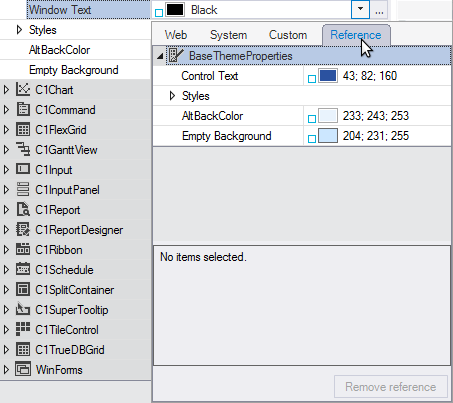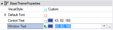 Notice the icon appears as a visual indicator that the Window Text property is referenced from the BaseThemeProperties Control Text.