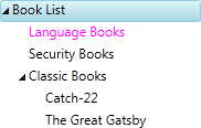3. Locate the tag that reads <c1:C1TreeViewItem Header="Language Books">. Within the <c1:C1TreeViewItem Header="Language Books"> add Foreground="Fuchsia"Background="LightPink". This will add a light pink background to the “Classic Books” tree item and a fuchsia color to the text. The XAML markup will resemble the following: