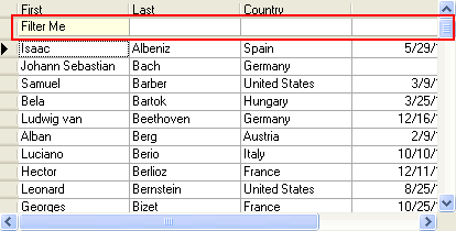 ' Set the C1DataColumn.FilterWatermark property of the first column. Me.C1TrueDBGrid1.Columns(0).FilterWatermark = "Filter Me" |