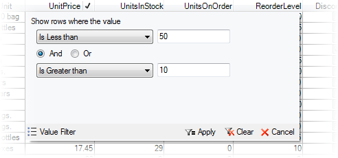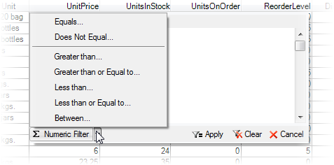 The data filtering feature follows the pattern used by C1FlexGrid. When users move the mouse over column headers, the grid displays a filter icon on the header. Clicking the icon invokes the filter editor which selects the data that should be displayed. Every column has a filter, and rows must pass all filters in order to be displayed.