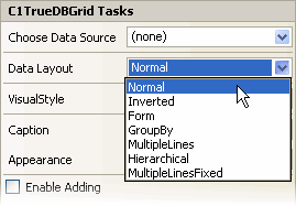 True DBGrid for WinForms allows you to view data in different ways through the DataView property, such as hierarchical, drop-down hierarchical, form, inverted, and multiple line. You can easily change the DataView property in the Properties window, in code, or by selecting a Data Layout option in the C1TrueDBGrid Tasks menu: