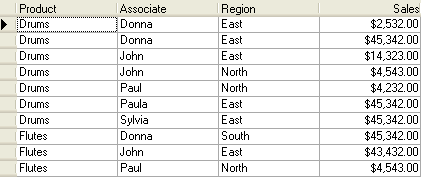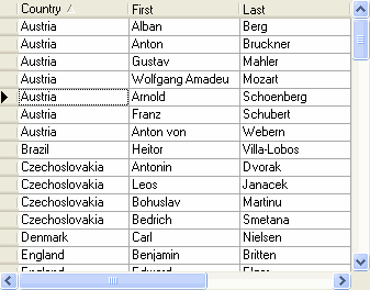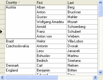 Executing this statement produces the following display. Note that when the current cell is in the Country column, the marquee spans all like-valued rows and takes on the appearance of a dotted rectangle, regardless of the setting of the MarqueeStyle property. The behavior of the marquee in other columns is not affected, however.