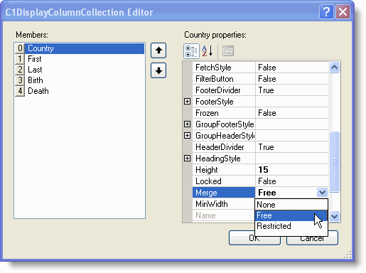 If a design-time layout is specified, the same effect can be achieved by setting the Merge property of the desired C1DisplayColumn object within the C1DisplayColumn Collection Editor, which can be accessed by clicking on the ellipsis button (...) after the DisplayColumns property in the Split Collection Editor.