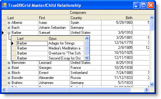 Notice that C1TrueDBGrid2 is rendered invisible and there is an expand icon ("+") beside the left most cell in each row. The master table contains a list of composers including vital statistics. Note, that as you scroll right, the expand icon remains in the left most cell at all times.