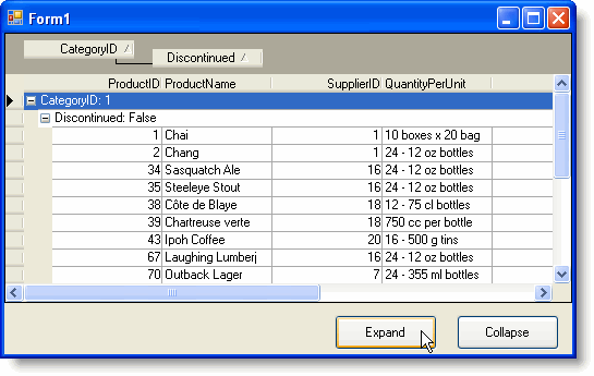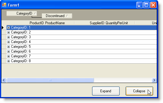To expand or collapse all grouped rows at once, you can use the ExpandGroupRow and CollapseGroupRow methods. In this topic you'll add buttons to your form that will expand and collapse your grouped grid using the ExpandGroupRow and CollapseGroupRow methods.