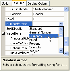 Locate the NumberFormat property in the left pane of the C1TrueDBGrid Designer and set it to Currency.
