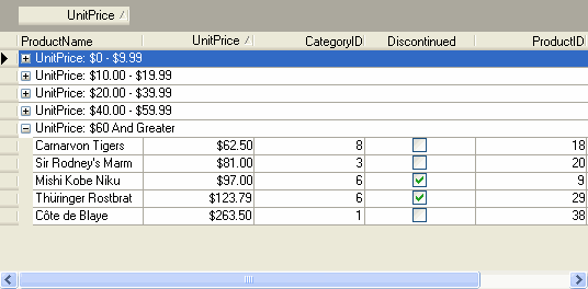 // Set the GroupInfo.Interval of the grid to Custom. this.c1TrueDBGrid1.Columns["UnitPrice"].GroupInfo.Interval = C1.Win.C1TrueDBGrid.GroupIntervalEnum.Custom; |