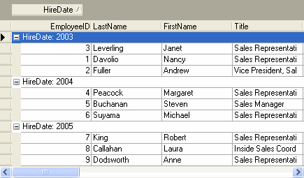 // Set the GroupInfo.Interval of the HireDate column to Year. this.c1TrueDBGrid1.Columns["HireDate"].GroupInfo.Interval = C1.Win.C1TrueDBGrid.GroupIntervalEnum.Year; |