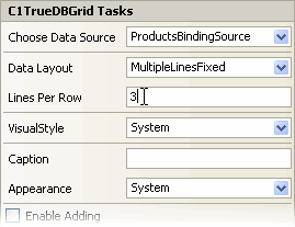 The DataViewEnum.MultipleLinesFixed data view is very similar to the DataViewEnum.MultipleLines data view but the number of subrows does not change once set. The number of subrows can be set using the LinesPerRow property which can be set at code or in the C1TrueDBGrid Tasks menu: