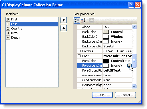Alternatively, an image can also be placed in the column header at design time using the C1DisplayColumn Collection Editor.