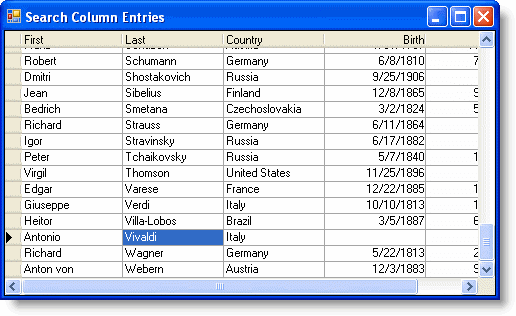 If more than one entry begins with the same letter, typing the next letter will highlight the entry with those letters. For example, typing Viv in the Last column will highlight "Vivaldi":
