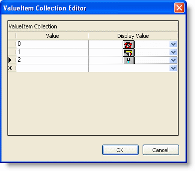 - Create three new ValueItem objects by clicking the Add button in the left pane. The possible values of the ContactType field are 0, 1, and 2, which represent telephone, mail, and personal contact, respectively. Bitmaps shall be displayed in the cell instead of these numeric values. If the full product is installed, the following files will be found in the Tutor10 subdirectory of the Tutorials installation directory: PHONE.BMP, MAIL.BMP, and PERSON.BMP.