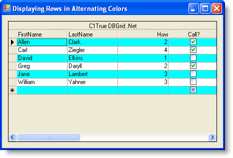 - Run the program and observe that C1TrueDBGrid1 displays data as in Tutorial 10: Enhancing the User Interface with In-Cell Bitmaps except that even-numbered rows have a light cyan background.