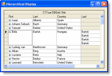 Me.ComposerTableAdapter.Fill(Me.DsMasterDetail.Composer) Me.C1TrueDBGrid1.DataView = C1.Win.C1TrueDBGrid.DataViewEnum.Hierarchical |
