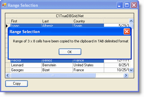 MessageBox.Show ("Range of " & Me.C1TrueDBGrid1.SelectedCols.Count & " x " & C1TrueDBGrid1.SelectedRows.Count & " cells have been copied to the clipboard in TAB delimited format")