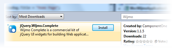 - Click Install next to jQuery.Wijmo.Complete. This will update the references for both Wijmo Open and Wijmo Complete.