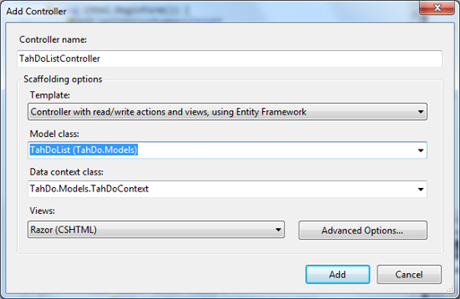 - You can also add a controller in the same way for a TahDoItemController. Follow steps 1-6 using TahDoItemController for the name and TahDoItem (TahDo.Models) for the Model class.