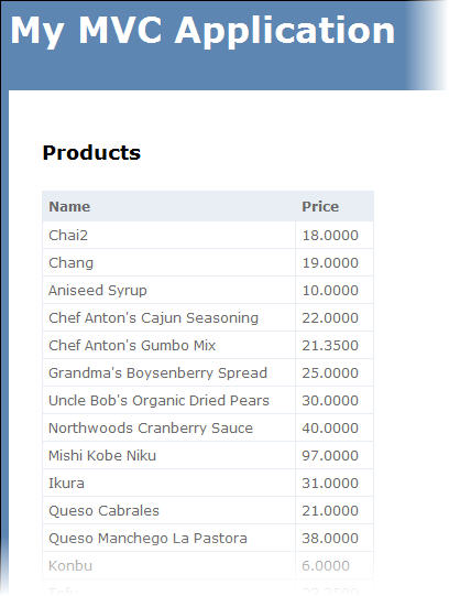 In the previous steps, you created a model and controller. In this step, you'll create a View showing a table on the home page of the project. Using Razor syntax, you'll create a loop to get the ProductName and UnitPrice for each product from the model.