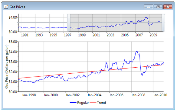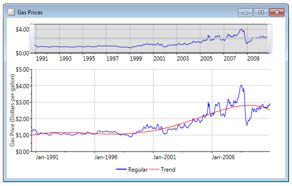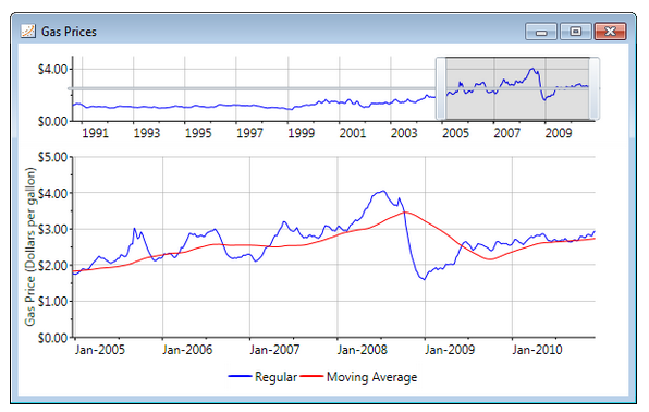 When setting up a Moving Average trendline, you must instantiate a new MovingAverage object and set the Period property. This property specifies the number of data points to use for the trendline. Since the gas price data is averaged every 7 days, a Period of 48 averages each year of data: