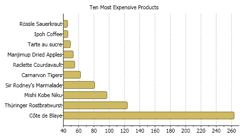 This tutorial provides step-by-step instructions for binding the C1Chart to a dataset declaratively. The data shows the information as a simple bar chart with one y-axis that represents the names of the products and one x-axis that represents the unit's price for each product. The products' ten most expensive products are displayed in descending order. The Bar chart uses one series to draw the unit price. A legend is not used since there is only one series.