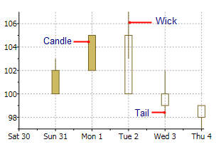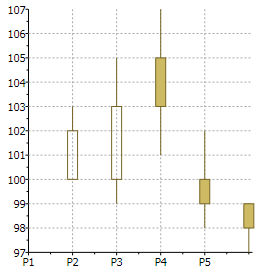 <c1chart:C1Chart ChartType="Candle"> <c1chart:C1Chart.Data> <c1chart:ChartData> <c1chart:HighLowOpenCloseSeries XValues="1 2 3 4 5" HighValues="103 105 107 102 99" LowValues="100 99 101 98 97" OpenValues="100 100 105 100 99" CloseValues="102 103 103 99 98" /> </c1chart:ChartData> </c1chart:C1Chart.Data> </c1chart:C1Chart> |