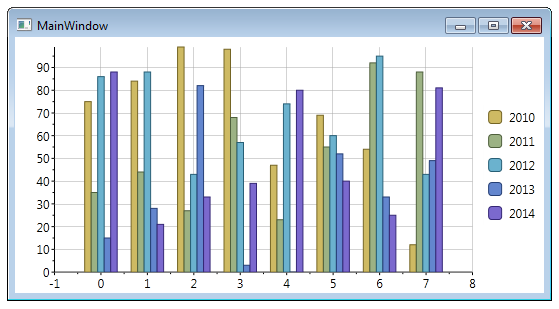 <c1:C1Chart Name="c1Chart1"> <c1:C1Chart.Data> <c1:ChartData SeriesItemsSource="{Binding SeriesDataCollection}"> <c1:ChartData.SeriesItemTemplate> <DataTemplate> <c1:DataSeries Label="{Binding Year}" ValuesSource="{Binding Values}" /> </DataTemplate> </c1:ChartData.SeriesItemTemplate> </c1:ChartData> </c1:C1Chart.Data> <c1:C1ChartLegend DockPanel.Dock="Right" /> </c1:C1Chart> |