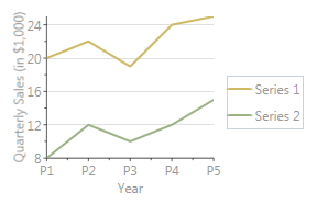 <Window x:Class="WpfApplication1.Window1" xmlns="http://schemas.microsoft.com/winfx/2006/xaml/presentation" xmlns:x="http://schemas.microsoft.com/winfx/2006/xaml" xmlns:c1="http://schemas.componentone.com/xaml/c1chart" Title="Window1" Height="300" Width="348" > <Grid> <!--Declare the C1Chart control Set the ChartType, Theme, and Palette properties to define the basic Chart appearance--> <c1:C1Chart Name="C1Chart1" ChartType="Line" Foreground="#a0000000" Background="#e0ffffff" Theme ="Vista" Palette ="Aspect" > <!--Define the chart View, which contains the chart axes.--> <c1:C1Chart.View> <c1:ChartView> <!-- Define the X axis (title, grid) --> <c1:ChartView.AxisX> <c1:Axis Title="Year" MajorGridStroke="Transparent"/> </c1:ChartView.AxisX> <!-- Define the Y axis (title, grid, annotation format) --> <c1:ChartView.AxisY> <c1:Axis Title="Quarterly Sales (in $1,000)" MajorGridStroke="#40000000" AnnoFormat="n0" /> </c1:ChartView.AxisY> </c1:ChartView> </c1:C1Chart.View> <!--Define the chart Data, which contains the data series.--> <c1:C1Chart.Data> <c1:ChartData> <!-- ItemNames define the labels along the X axis --> <c1:ChartData.ItemNames>P1 P2 P3 P4 P5</c1:ChartData.ItemNames> <!--Each DataSeries specifies a label (shown in the legend) and the series data--> <c1:DataSeries Label="Series 1" RenderMode="Default" Values="20 22 19 24 25" /> <c1:DataSeries Label="Series 2" RenderMode="Default" Values="8 12 10 12 15" /> </c1:ChartData> </c1:C1Chart.Data> <!--Add a ChartLegend, docked to the right of the chart, to display a legend containing the series and their styles.--> <c1:C1ChartLegend DockPanel.Dock="Right" /> </c1:C1Chart> </Grid> </Window> |