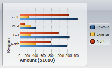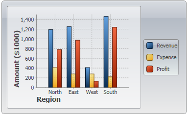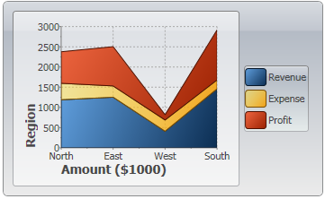 // configure label axis labelAxis.Title = CreateTextBlock("Region", 14, FontWeights.Bold); // configure value axis _c1Chart.View.AxisX.Title = CreateTextBlock("Amount ($1000)", 14, FontWeights.Bold); c1Chart.View.AxisX.AutoMin = false; c1Chart.View.AxisX.Min = 0; c1Chart.View.AxisX.MajorUnit = 200; c1Chart.View.AxisX.AnnoFormat = "#,##0 "; |