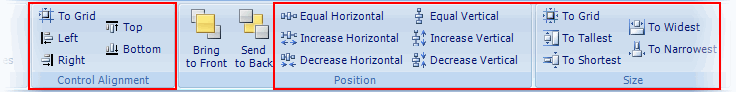 When multiple fields are selected, you can use the buttons on the Control Alignment, Position, and Size groups of the Appearance tab to align, resize, and space them. When you click any of these buttons, the last field in the selection is used as a reference and the settings are applied to the remaining fields in the selection.