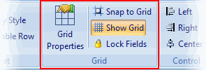 The Snap to grid and Show grid buttons located in the Grid group in the Appearance tab provide a grid that helps position controls at discrete positions. While the grid is on, the top left corner of the fields will snap to the grid when you create or move fields. You can change the grid units (English or metric) by clicking the Application button and selecting Options from the menu.