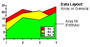 An area chart draws each series as connected points of data, filled below the points. Each series is drawn “on top” of the preceding series. The series can be drawn independently, or stacked. Using ChartStyles, you can customize the fill properties of each series.