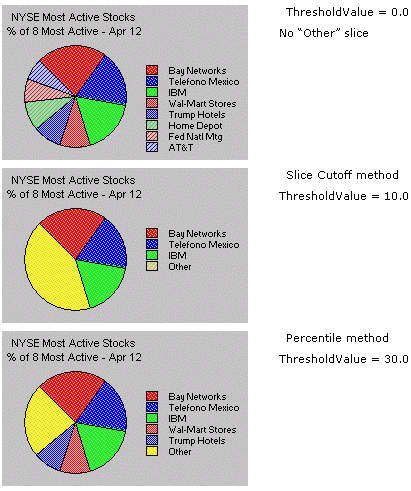 Pie charts are often more effective if unimportant values are grouped into an “Other” category. Use the pie ThresholdMethod property to select the grouping method to use. “SliceCutoff” is useful when you know the data value that should be grouped into the “Other” slice. “Percentile” is useful when you want a certain percentage of the pie to be devoted to the “Other” slice.