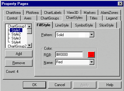 The group of attributes that define how a series of data looks in the chart is called a ChartStyle. This page lists the currently defined Chartstyles and allows you to modify them as required. You can modify each ChartStyle by highlighting a specific style in the left pane then choosing the inner tab and property you wish to change.