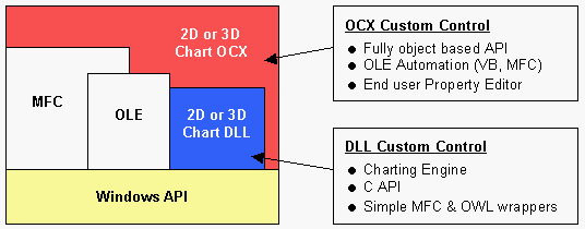 The DLL control is the “charting engine” for both the OCX and DLL. It stores the internal values of the chart’s properties and performs axis calculations and all low-level chart functions. The OCX builds on this charting engine, adding a fully object-based API, support for OLE automation, persistence, and an end-user Property Editor. The following diagram illustrates this relationship.