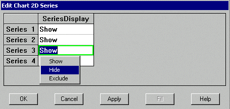 Use a right mouse click to bring up the SeriesDisplay values for the selected series and click the desired value. Show displays the series. Hide includes the series in the ChartGroup, but does not draw the series. Exclude eliminates the series from the ChartGroup without actually deleting it. Excluded series are not used for automatic calculations such as axis limits and stacked charts.