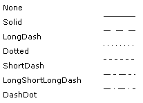 Use the Pattern property to set the line drawing pattern, the Width property to set its width, and the Color properties to set the line color for a ChartStyle. The valid patterns are shown below: