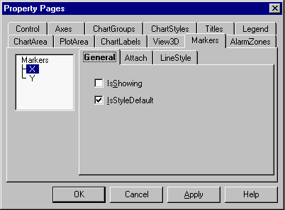 A marker is a vertical or horizontal line drawn on top of the chart to identify a particular data point or chart coordinate. This page lists the currently defined properties for the chart Markers and allows you to modify them as required. You can modify each marker by highlighting the specific axis in the left pane then choosing the inner tab and property you wish to change.
