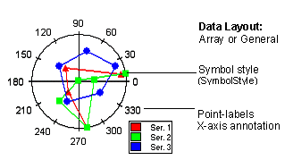 A polar chart draws the x and y coordinates in each series as (theta,r), where theta is amount of rotation from the origin and r is the distance from the origin. theta may be specified in either degrees (default), radians or grads. Since the x-axis is a circle, the x-axis maximum and minimum values are fixed. The series can be drawn independently, or stacked.