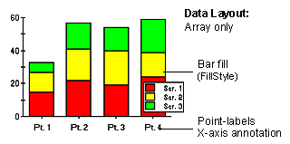 A stacking bar chart draws each series as a portion of a stacked bar cluster, the number of clusters being the number of points in the data. Each bar displays the nth data point in each series. Positive values are displayed above the X-axis, and negative values are displayed below the X-axis. Using ChartStyles, you customize the fill properties of each series. You can also customize bar cluster properties and 3D display properties.