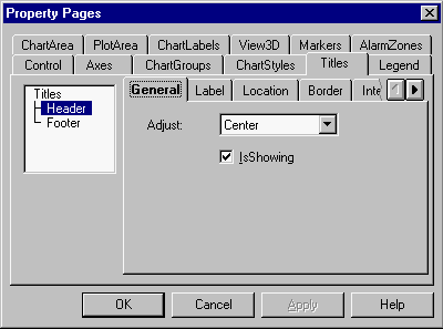 This page lists the currently defined Titles (Header and Footer) and allows you to modify them as required. You can modify each Title by highlighting the specific header or footer in the left pane then choosing the inner tab and property you wish to change.