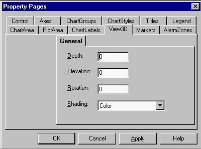This page lists the currently defined properties for the 3D Effects and allows you to modify them as required. Note, only ribbon plot, area, bar and pie charts can support 3D effects.