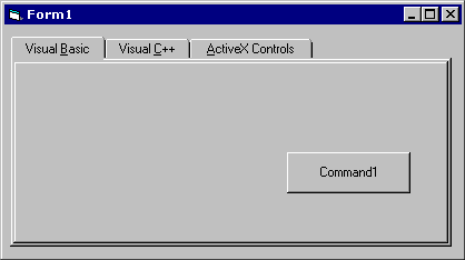 Create a new C1Tab control on your form just like you would create any other control: Click the tool for the C1Tab control on Visual Basic's Toolbox, then move the pointer onto the form. The pointer will become a cross hair. Place the cross hair near the top left corner of the form. Hold the left mouse button, drag the cross hair to a point near the bottom right corner of the form, and then release the button.