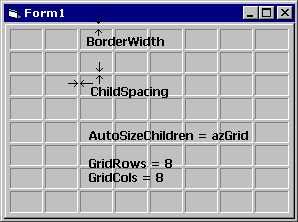 These properties affect the grid as well as the other sizing modes. BorderWidth determines the distance between the edges of the control and its client area, and ChildSpacing determines the distance between adjacent controls.