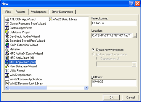 To start the tutorial, run Visual C++ and create a new project. Select the File|New menu option, then select the Projects page and select the MFC AppWizard (exe) option. Enter a name and location for the new project, and then click OK.
