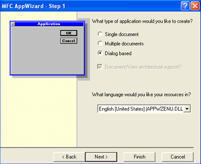 The MFC AppWizard will appear. Select the Dialog Based option, click Finish, and then OK.